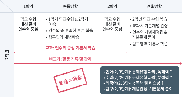 ¿¹½Àº¸´Ù´Â º¹½À À§ÁÖ·Î °øºÎÇØ¾ß ÇÕ´Ï´Ù. ±³°ú ¹× ¼ö´ÉÀº ¾ð¼ö¿Ü Áß½ÉÀÇ ±âº»¼ ÇнÀÀÌ ÀÌ·ç¾îÁ®¾ß ÇÕ´Ï´Ù. ¿µ¿ªº°·Î »ìÆìº¸¸é ¾ð¾î´Â ¹®Á¦À¯Çü ÆÄ¾Ç ¹× µ¶ÇØ·ÂÀ» ³ôÀÌ´Â µ¥ ÁÖ·ÂÇϰí, ¼ö¸®´Â ¹®Á¦À¯Çü ÆÄ¾Ç ¹× ºÐ¼®·ÂÀ» Çâ»ó½Ã۴µ¥ ÁÖ·ÂÇØ¾ß ÇÕ´Ï´Ù ±×¸®°í ¿Ü±¹¾î´Â µ¶ÇØ ¹× ¸®½º´× ½Ç·ÂÀ» Ű¿ìµµ·Ï Çϰí, ޱ¸´Â °³³ä¿Ï¼º°ú ±âº»¹®Á¦ Ç®ÀÌ¿¡ ÁßÁ¡À» µÎ¾î¾ß ÇÕ´Ï´Ù. ±×¸®°í ÀÌ ½Ã±â¿¡ ºñ±³°ú´Â 1Çг⠶§¿Í ¸¶Âù°¡Áö·Î Ȱµ¿±â·Ï ¹× °ü¸®¿¡ ÁýÁßÇØ¾ß ÇÕ´Ï´Ù.