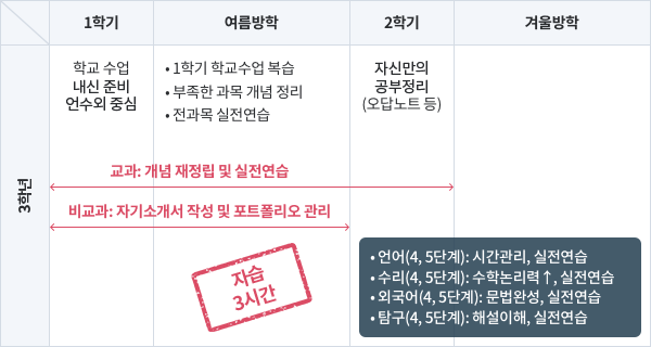 ÀÚ½ÅÀÇ ÇнÀ½Ã°£À» ÃÖ´ë·Î È®º¸ÇÏ´Â °ÍÀÌ Áß¿äÇÕ´Ï´Ù. Àû¾îµµ 3½Ã°£ Á¤µµ´Â ÀÚ½ÅÀÇ °øºÎ½Ã°£À¸·Î È®º¸Çϵµ·Ï ÇØ¾ß ÇÕ´Ï´Ù. ¿µ¿ªº°·Î »ìÆìº¸¸é ¾ð¾î´Â ½ÇÀü¿¬½ÀÀ» ÅëÇØ ½Ã°£°ü¸® ´É·ÂÀ» Çâ»ó½Ã۰í, ¼ö¸®´Â ¼öÇÐ³í¸®·Â Çâ»óÀ» À§ÇØ ½ÇÀü¿¬½ÀÀ» ¹Ýº¹ÇØ¾ß ÇÕ´Ï´Ù. ¿Ü±¹¾î´Â ¹®¹ý¿Ï¼º°ú ½ÇÀü¿¬½À¿¡ ½Ã°£À» ÅõÀÚÇϰí, ޱ¸´Â ÇØ¼³À» ÀÌÇØÇÏ°í ½ÇÀü¿¬½ÀÀ» ÅëÇØ ½ÇÀü°¨°¢À» °®µµ·Ï ÇØ¾ß ÇÕ´Ï´Ù. ¶ÇÇÑ, ÀÌ ½Ã±â¿¡ ºñ±³°ú´Â ÀÚ±â¼Ò°³¼ ÀÛ¼º ¹× Æ÷Æ®Æú¸®¿À °ü¸®¿¡ ÁßÁ¡À» µÎµµ·Ï ÇØ¾ß ÇÕ´Ï´Ù.