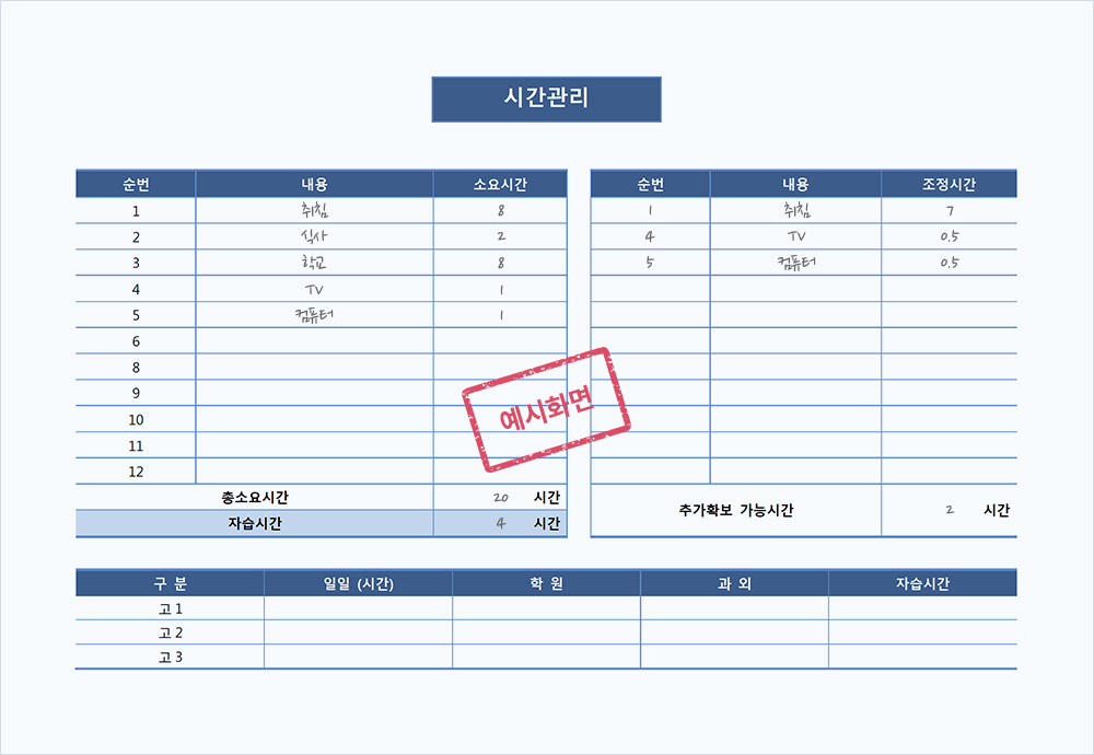 ½Ã°£°ü¸®´Â ÇнÀ´É·Â Çâ»ó Àü·«¿¡ ÀÖ¾î¼ °¡Àå ±âÃÊÀûÀ¸·Î È®ÀÎÇØ ºÁ¾ß ÇÒ ºÎºÐÀÔ´Ï´Ù. ´ÙÀ½Ç¥¸¦ ÀÌ¿ëÇØ¼ ÇöÀç ÀÚ½ÅÀÇ ÇнÀ½Ã°£À» È®ÀÎÇØ º¸°í. ÀÚ½ÅÀÌ ÇöÀç ÇнÀ À̿ܿ¡ »ç¿ëÇÏ´Â Ç׸ñ Áß¿¡¼ Á¶Á¤ÇÒ ¼ö ÀÖ´Â ºÎºÐÀÌ ÀÖ´Ù¸é, Á¶Á¤ °¡´ÉÇÑ Ç׸ñÀ» ã¾Æ ÀÚ±âÁÖµµÇнÀ¿¡ Ȱ¿ëÇϵµ·Ï Çϱ⠹ٶø´Ï´Ù.