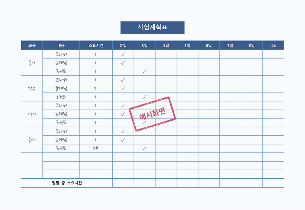 ½ÃÇè°èȹǥ ÀÛ¼º½Ã °¡Àå ¸ÕÀú ÇØ¾ß ÇÒ ÀÏÀº °øºÎ ´ë»óÀ» Á¤ÇÏ´Â °ÍÀÔ´Ï´Ù. ±¸Ã¼ÀûÀ¸·Î ¾î¶² °ú¸ñÀÇ ¾î¶² ±³À縦 »ç¿ëÇÒ °ÍÀÎÁö¸¦ °ú¸ñº°·Î ¹Ì¸® Á¤¸®ÇÕ´Ï´Ù. ¾ÆÁ÷ ½ÃÇè ¹üÀ§°¡ ³ª¿ÀÁö ¾Ê¾Ò´Ù¸é °¢°¢ÀÇ ±³Àç¿¡¼ °øºÎÇØ¾ß ÇÒ ¹üÀ§¸¦ ³ª¶õÈ÷ ±âÀçÇÕ´Ï´Ù. ÀÛ¼º¹æ¹ýÀº ½Ã°£°ü¸® Ç¥¸¦ Âü°íÇØ¼ °ú¸ñº°·Î ´Ü¿ø³»¿ëÀ» ÇÑ ½Ã°£ ´ÜÀ§·Î ³ª´¯´Ï´Ù. ½Ã°£´ç °øºÎÇÒ ³»¿ëÀÌ Á¤ÇØÁö¸é ³¯Â¥ º°·Î È®º¸ °¡´ÉÇÑ °øºÎ½Ã°£À» °¨¾ÈÇÏ¿© ÁÖ¿ä°ú¸ñ À§ÁÖ·Î ÀûÀýÈ÷ ¹èºÐÇϰí, ÃÖ´ëÇÑ ±¸Ã¼ÀûÀ¸·Î ¹üÀ§¸¦ ¼¼ºÐÇÏ¿© Àû¾î¾ß ÇÕ´Ï´Ù. ±×¸®°í ÁÖÀÇÇØ¾ß ÇÒ Á¡Àº ¹Ýµå½Ã 3ÀÏ Á¤µµ ÀÌ»ó Review½Ã°£À» °¡Á®¾ß ÇÑ´Ù´Â °ÍÀÔ´Ï´Ù.